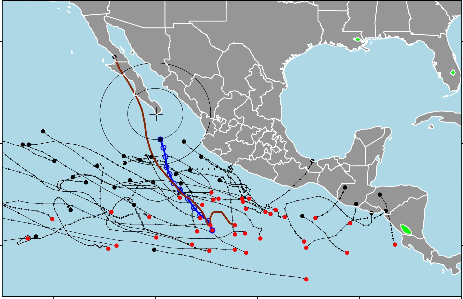 Trayectoria del ciclón tropical Alvin (azul) desde el 28 de junio y 31 de mayo de 2025. Las líneas negras son las trayectorias de los primeros ciclones de cada temporada desde 1998 a 2024; puntos rojos indican el inicio de cada trayectoria mientras que el punto negro su fin. La línea color marrón es la trayectoria de la tormenta tropical Blanca (2015). Los círculos concéntricos están distribuidos en radios de 250, 500 y 750 kilómetros desde Cabo San Lucas. Fuente de datos: Centro Nacional de Huracanes.