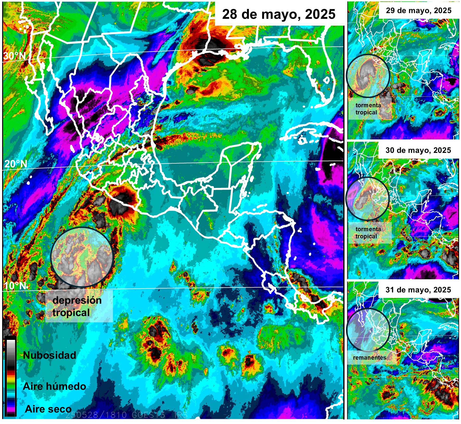 Imagen de satélite geoestacionario (GOES, banda vapor de agua) durante el desarrollo de la depresión tropical Alvin el 28 de mayo de 2025; a la derecha, imágenes durante tres días posteriores. Cada imagen indica distribución de aire seco (tono rosa-azul), aire húmedo (verde) y nubosidad (gris). Aire seco representa una condición que no es favorable para el desarrollo de ciclón tropical. Los círculos indican la localización de Alvin cada día.