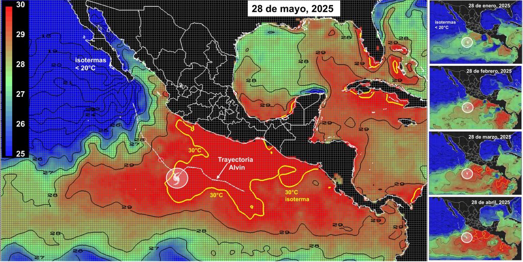 Distribución de temperatura de superficie del mar (°C) el 28 de mayo de 2025. Se indican isotermas cada grado desde 18°C hasta 30°C, la trayectoria del ciclón tropical Alvin así como la posición de su centro de circulación (línea blanca). El círculo representa el sitio en que Alvin empezó a contar con pronósticos oficiales en el Centro Nacional de Huracanes. Los mapas en la columna derecha son distribuciones de temperatura en meses anteriores.