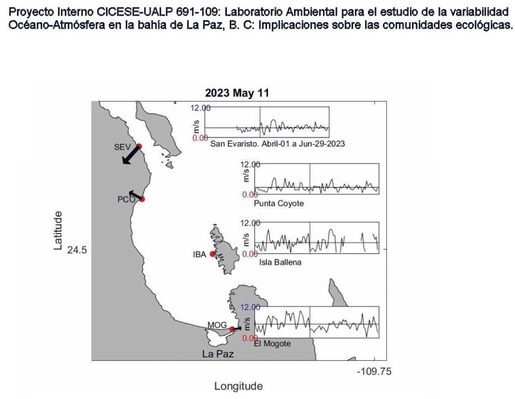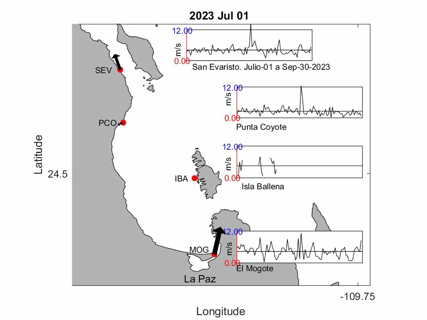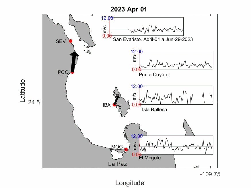 La animación presenta el comportamiento del viento (Dirección y rachas de viento) en cada una de las 4 Estaciones Meteorológicas durante la Primavera de 2023 (01-abril al 29 de junio) en la Bahía de La Paz. La punta de la flecha de los vectores indica la dirección hacia donde se dirige el viento.