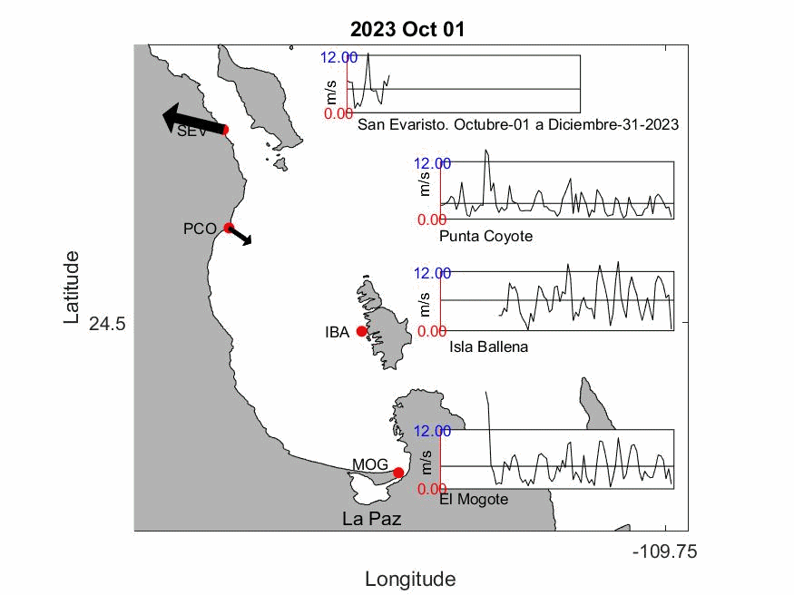 Explicación: La animación presenta el comportamiento del viento (velocidad y dirección del viento) en cada una de las 4 Estaciones Meteorológicas durante el otoño de 2023 (01-octubre al 30 de diciembre) en la Bahía de La Paz. La punta de la flecha del vector indica la dirección hacia donde se dirige el viento.