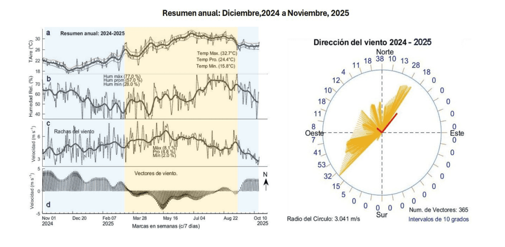 Durante el período anual de Diciembre, 2024-Noviembre, 2025 (Figura 1)  los valores diarios de la temperatura del aire (Tair), Humedad Relativa (Hr), Rachas y vectores de viento registrados en la Estación La Paz mostraron valores máximos (línea en rojo, >32.0° C) durante el período primavera-verano (sombreado en amarillo) y mínimos durante otoño-invierno  (sombreado en azul) con un valor de promedio anual de 25.5°C, (línea en negro) y temperaturas mínimas (línea en azul, 21.5 °C) durante invierno, mostrando un aumento de la temperatura desde el mes de marzo hasta septiembre (sombreado en amarillo).