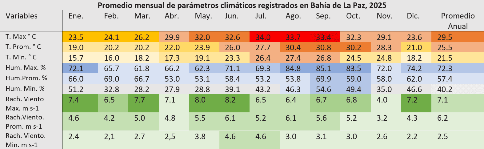 Tabla 1. Valores mensuales de parámetros climáticos registrados en Bahía de La Paz, durante 2025 calculado a partir de datos diarios de los parámetros registrados durante el período noviembre, 2024 - diciembre, 2025. Los colores realzan los valores máximos mensuales de cada parámetro.