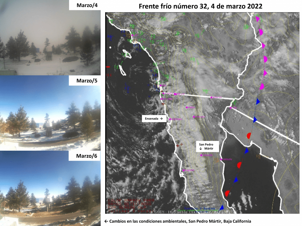 Ha finalizado una parte de la temporada fría en el hemisferio norte, en particular, el invierno inició el 21 de diciembre de 2021 y duró 89 días para terminar el 20 de marzo de 2022 . La temporada incluye el desarrollo de frentes fríos, tormentas invernales y eventos de norte. Un frente frío es un sistema de transición entre masas de aire con propiedades diferentes respecto a temperatura y humedad. Masas de aire tanto cálido como frío se desplazan durante varios días con cambios en su estructura e intensidad en la atmósfera. Por lo general, el desarrollo de los frentes fríos se asocia a cambios notables en la temperatura, humedad, nubosidad, magnitud y dirección del viento así como precipitación ya sea en forma líquida (lluvia) o sólida (nieve). En México, parte de la precipitación durante el invierno se debe al paso de sistemas frontales.
