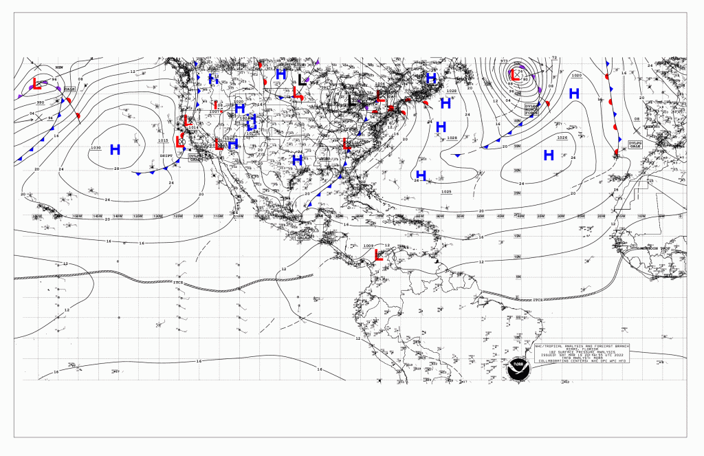 Distribución espacial de sistemas meteorológicos al mediodía del 19 de marzo, 2022. Fuente, Centro Nacional de Huaracanes, NOAA.