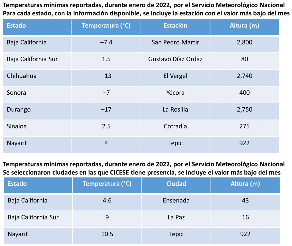 Hasta el día de hoy (25 de marzo), como parte de la temporada invernal 2021-2022, el SMN ha contabilizado 38 frentes fríos. El primero fue en septiembre de 2021 y en total ha habido 38 sistemas mientras que 32 ocurrieron en el periodo de mayor frecuencia: 5 en noviembre, 7 en diciembre, 9 en enero, 4 en febrero y 7 en marzo. De estos, 5 frentes se asociaron a tormentas invernales y 19 frentes a eventos de norte con viento máximo de más de 100 km/h en sitios costeros del Golfo de México. Como ejemplo de referencia, durante el mes de enero se reportaron los siguientes valores de temperatura mínima en el noroeste de México.